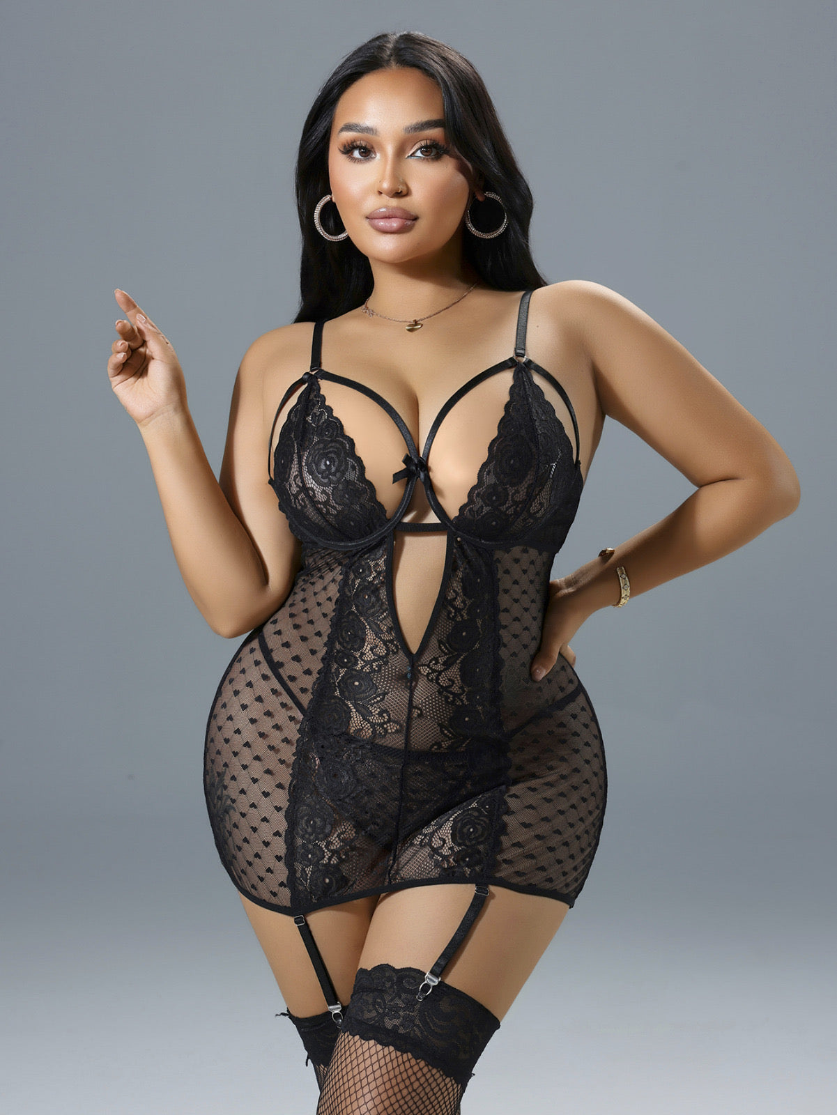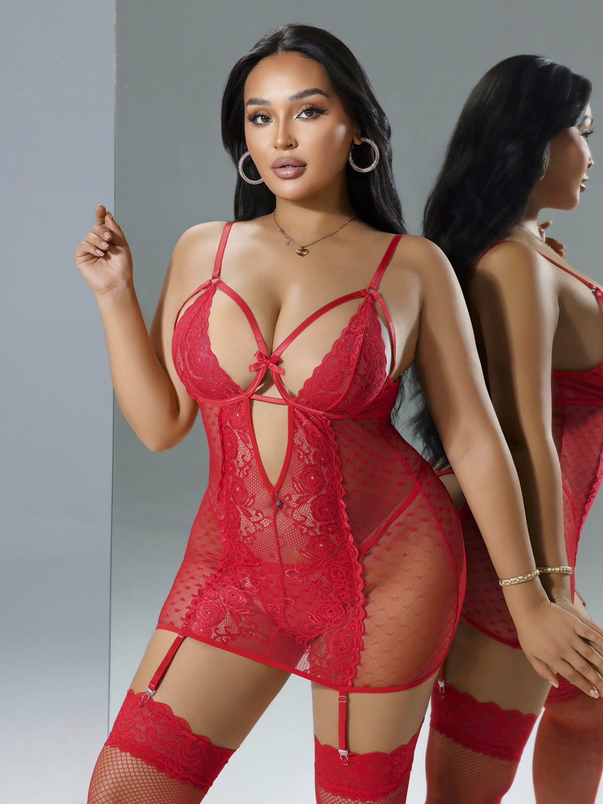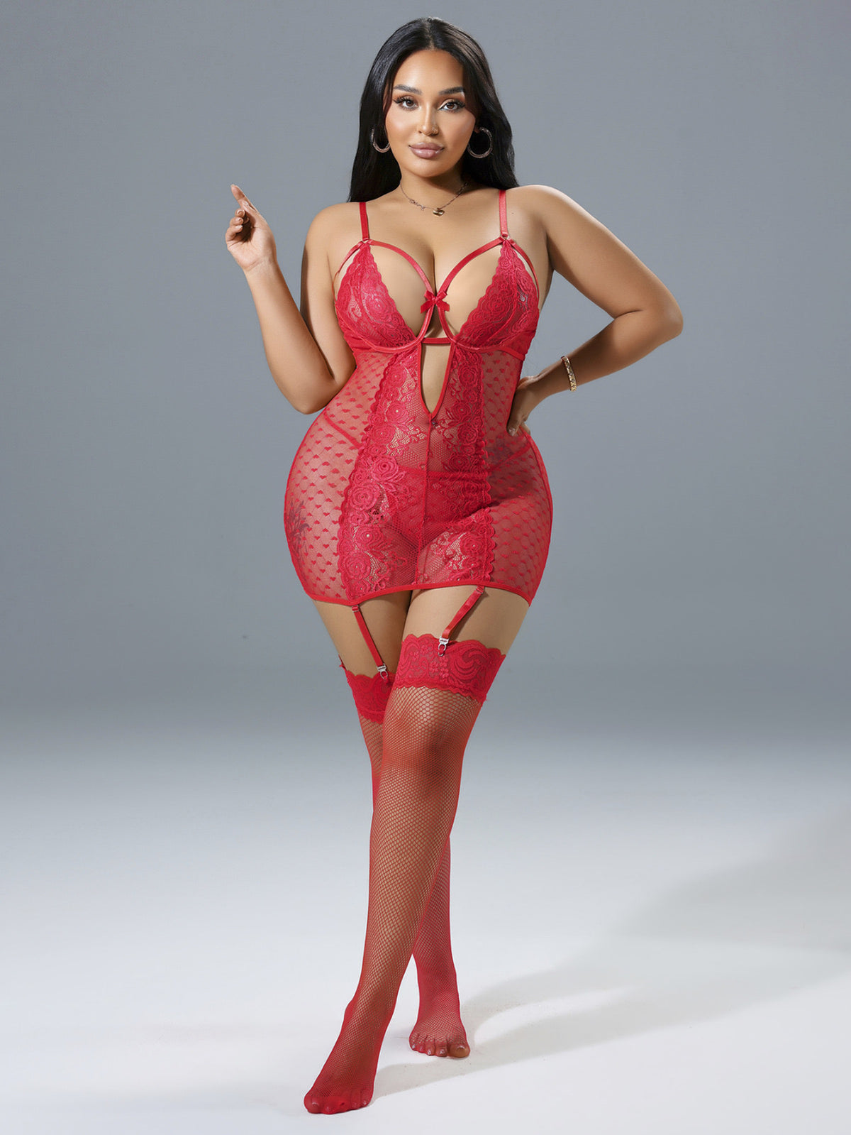 Czarna i Czerwona Koronkowa Bielizna Erotyczna Plus Size z Pończochami z Fiszbinami - XL / Czarny